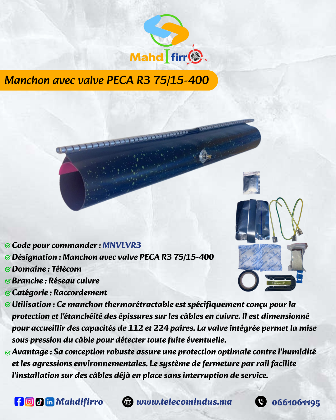 Ce manchon thermorétractable avec valve constitue une solution de protection et d’étanchéité pour les câbles pressurisés au sein des infrastructures de télécommunication. Fabriqué en matériau polymère robuste, il assure une isolation hermétique contre l’humidité et les agressions extérieures tout en permettant le contrôle de la pression interne. La structure est conçue pour se rétracter uniformément sous l’effet de la chaleur afin d’épouser parfaitement la forme du raccordement ou de la gaine du câble. La valve intégrée facilite les opérations de maintenance et de surveillance du réseau en autorisant l’injection ou la mesure de l’air sec. Ce dispositif est particulièrement adapté pour la réparation ou la jonction sécurisée de câbles dans des environnements exigeants.